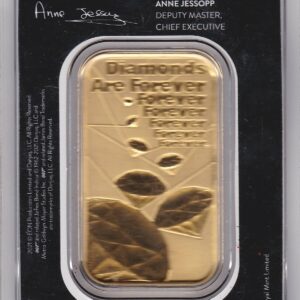 The obverse of this gold one ounce bar features the Royal Mint Logo & Legend, 007 Logo central, weight & fineness below with diamond shapes covering the background. The reverse features the James Bond film title ‘Diamonds Are Forever’ with diamond shapes below.