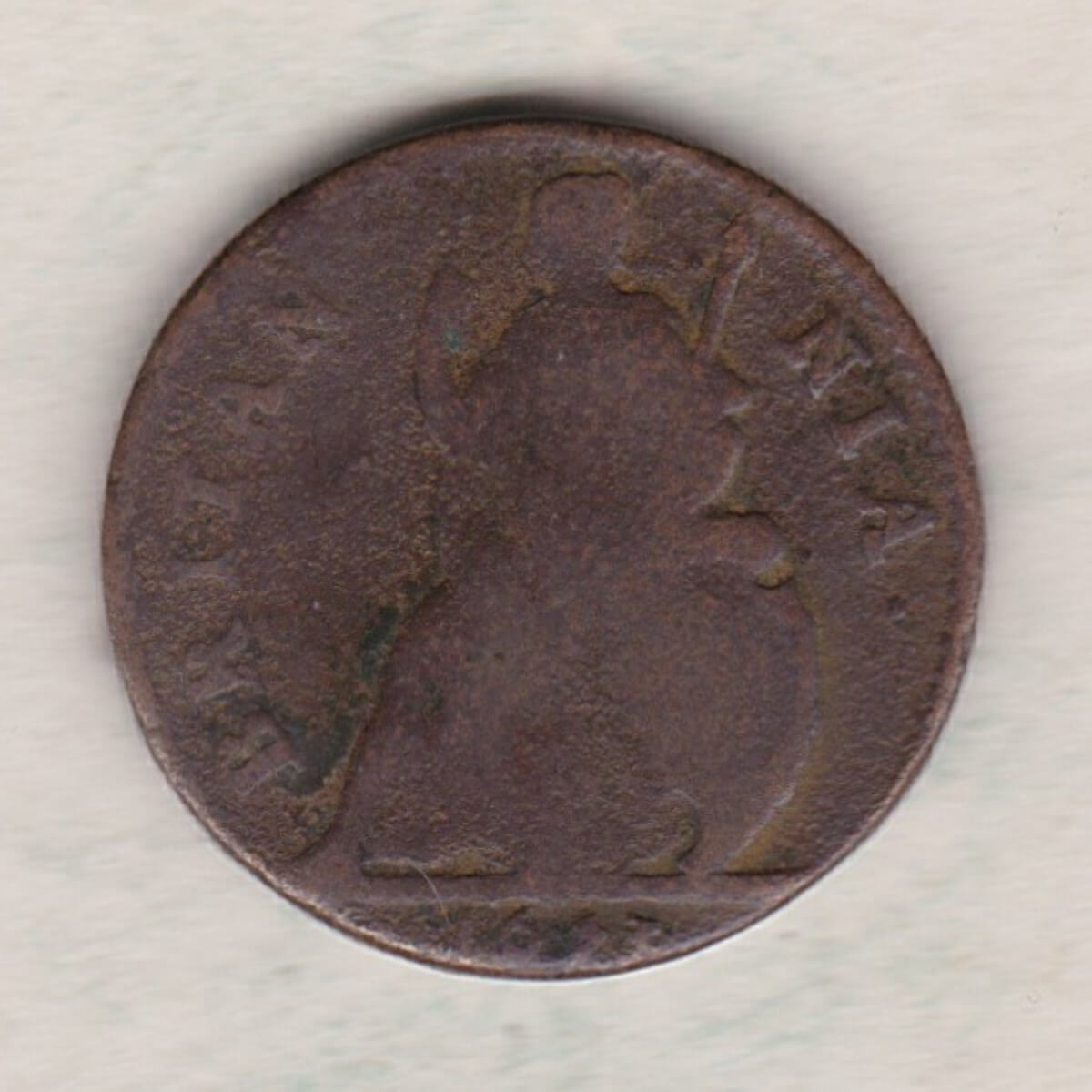 The 1673 farthing was struck in copper. The obverse side of the coin features the laureate and cuirassed bust of King Charles II facing left, with legend around. The reverse features a seated figure of Britannia facing left, holding spear in left hand, olive branch in raised right hand, shield with Union flag resting at left, with legend around, and date in exergue.