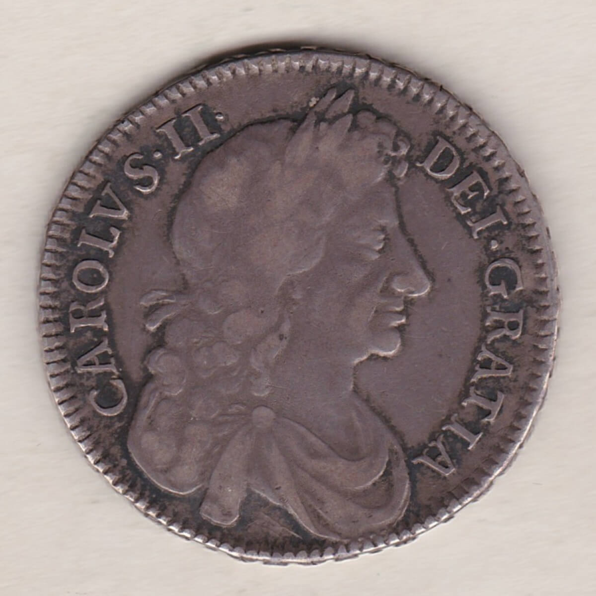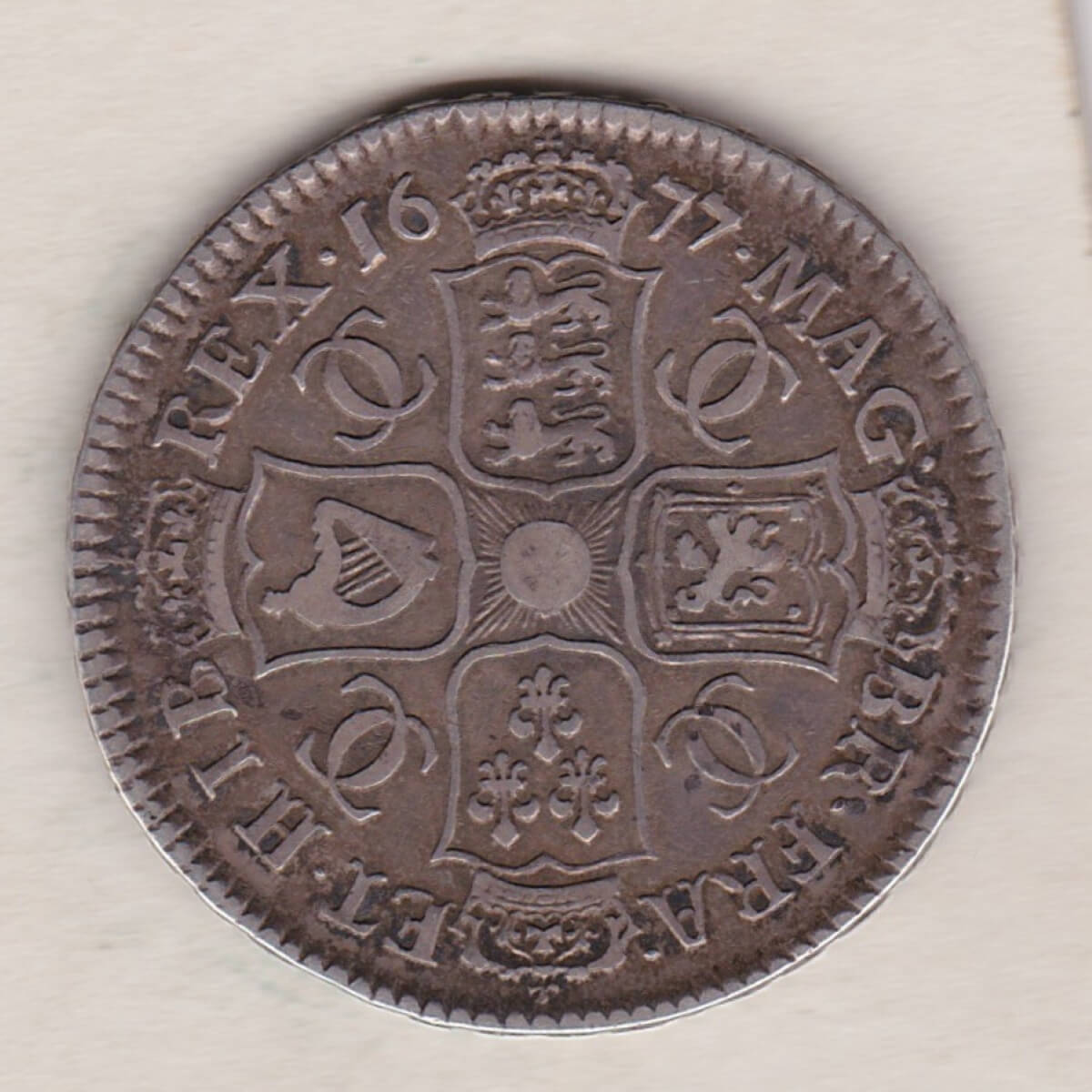 The 1677 halfcrown is a 0.925 silver coin. The obverse features the fourth laureate and draped bust of King Charles II facing right, with legend around. The reverse features the crowned cruciform shields around central Garter star with interlinked C’s in angles, divided date above, with legend around.