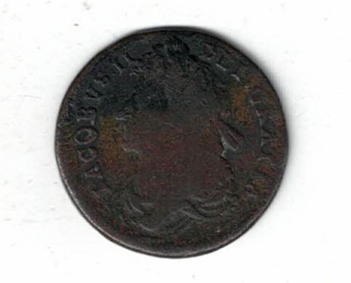 The obverse features the head of James II facing right. The reverse features a Gaelic harp with date above.