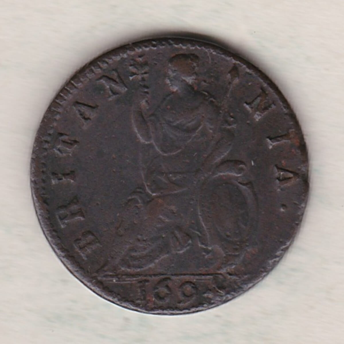 The 1694 farthing was struck in copper. The obverse side of the coin features the conjoined laureate and cuirassed busts of King William and Queen Mary facing right, with legend around. The reverse features a seated figure of Britannia facing left, holding spear in left hand, olive branch in left, shield with Union flag resting at left. With legend around, and date in exergue.