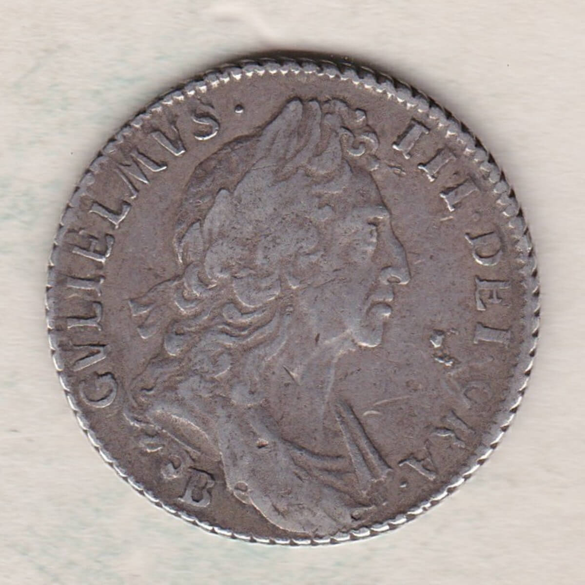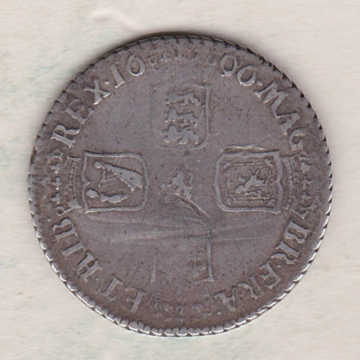 The 1696 B shilling is a 0.925 silver coin struck in Bristol. The Obverse features a laureate or draped bust of William III facing right with the legend surrounding it. The Reverse features the crowned cruciform shields around central Nassau lion, divided date above, with legend around.