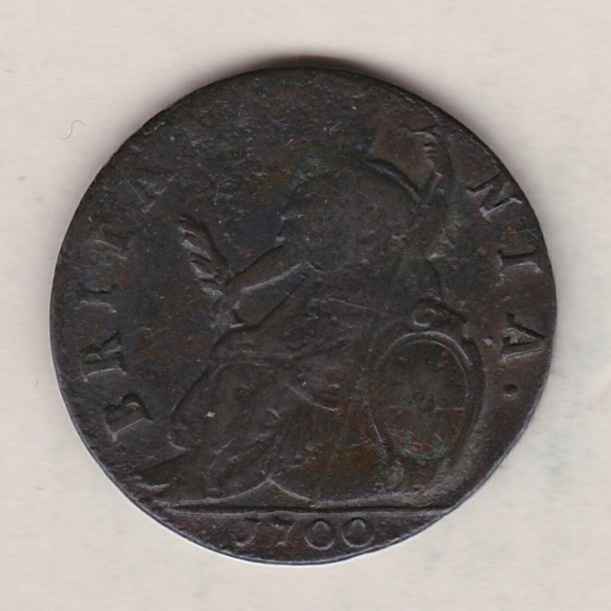 The 1700 halfpenny was struck in copper. The obverse side of the coin features the laureate bust of King William III facing right, with legend continuous over bust. The reverse depicts a seated figure of Britannia, facing left, with a shield, spear, and sprig of leaves and berries, with legend around, and date in exergue.