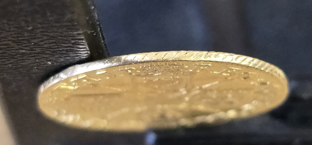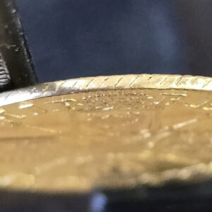 Although this example has good detail, the coin is ex mount. The coin is misshapen and worn at the top above the Queen’s portrait and at the edges.