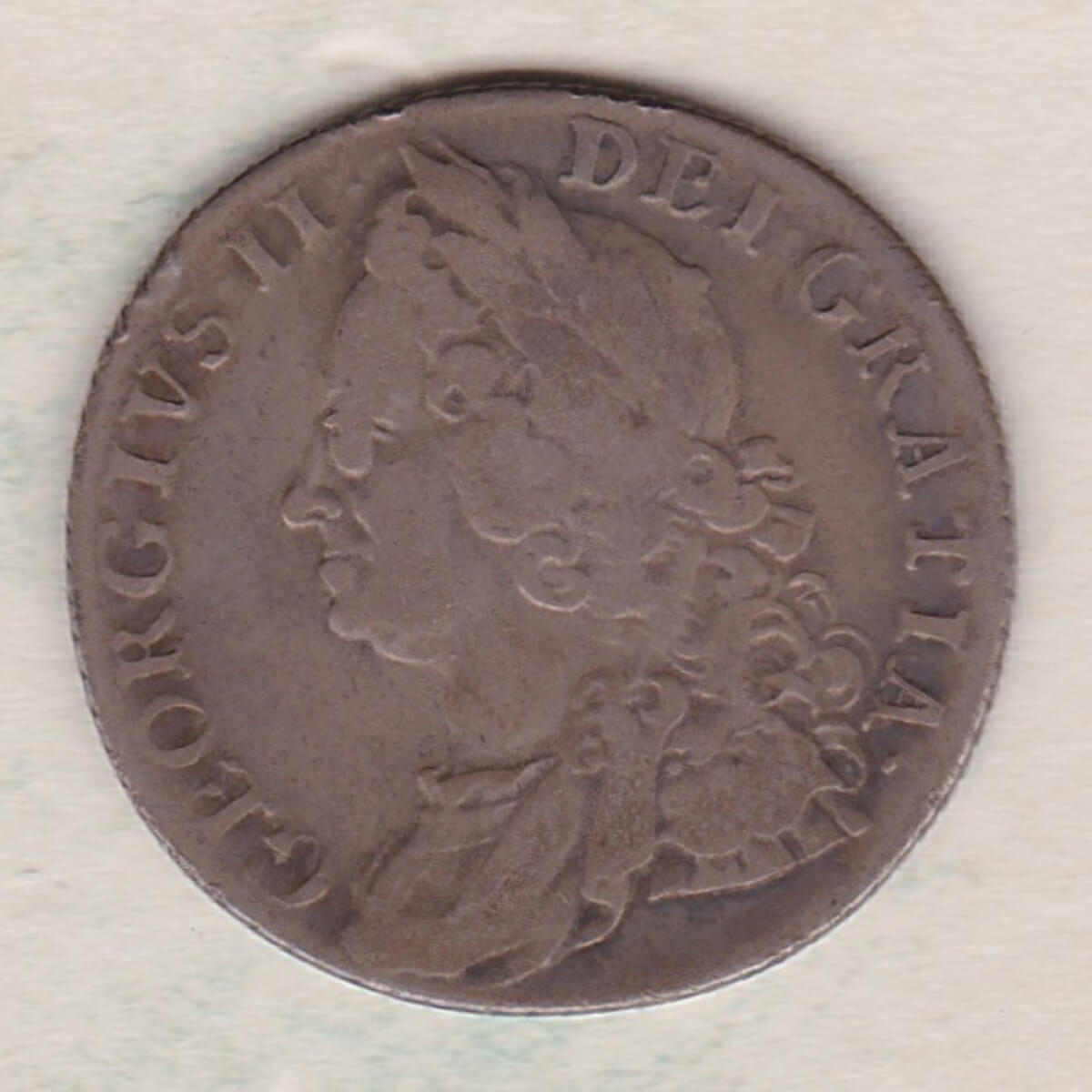 1758 silver shilling coin featuring a laureate and draped bust of George II. The crowned cruciform shields with central Garter star on the Reverse.1758 Silver Shilling Coin – George II