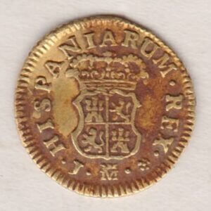 This 1759 J gold coin was struck in Madrid, Spain in 0.917 gold. The obverse of this coin features the head of King Ferdinand VI facing right. The reverse features crowned coat of arms of Spain. The crowned M mint mark also appears at the bottom of the reverse.