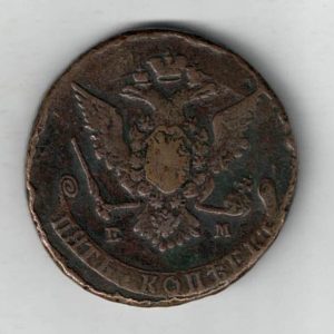 The 1769 five kopecks is a coin struck in copper. The obverse of this coin features a crowned monogram, divides date within wreath. The reverse features a crowned double headed eagle with initials divided below.