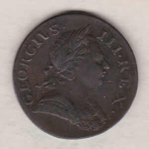 1772 copper halfpenny coin featuring King George III on the Obverse. Britannia seated facing left holding a trident on the Reverse. 1772 Copper Halfpenny – George III
