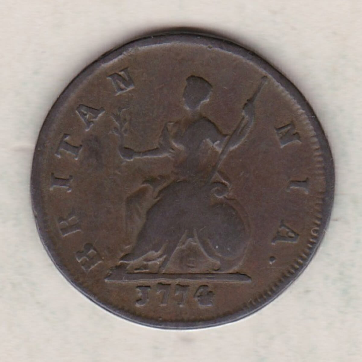 The 1774 farthing was struck in copper by the Royal Mint. The obverse side of the coin features the laureate and cuirassed bust of King George III facing right, with legend around. The reverse features a seated figure of Britannia facing left, trident in left hand, olive branch in right, shield bearing the Union flag resting on left, with legend around, and date in exergue.
