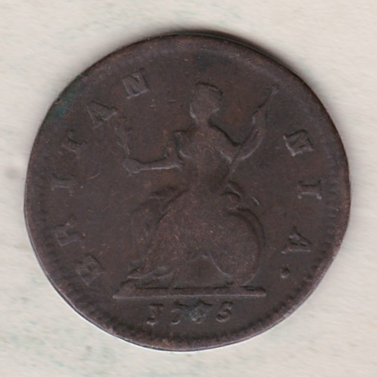 The 1775 farthing was struck in copper by the Royal Mint. The obverse side of the coin features the laureate and cuirassed bust of King George III facing right, with legend around. The reverse features a seated figure of Britannia facing left, trident in left hand, olive branch in right, shield bearing the Union flag resting on left, with legend around, and date in exergue.
