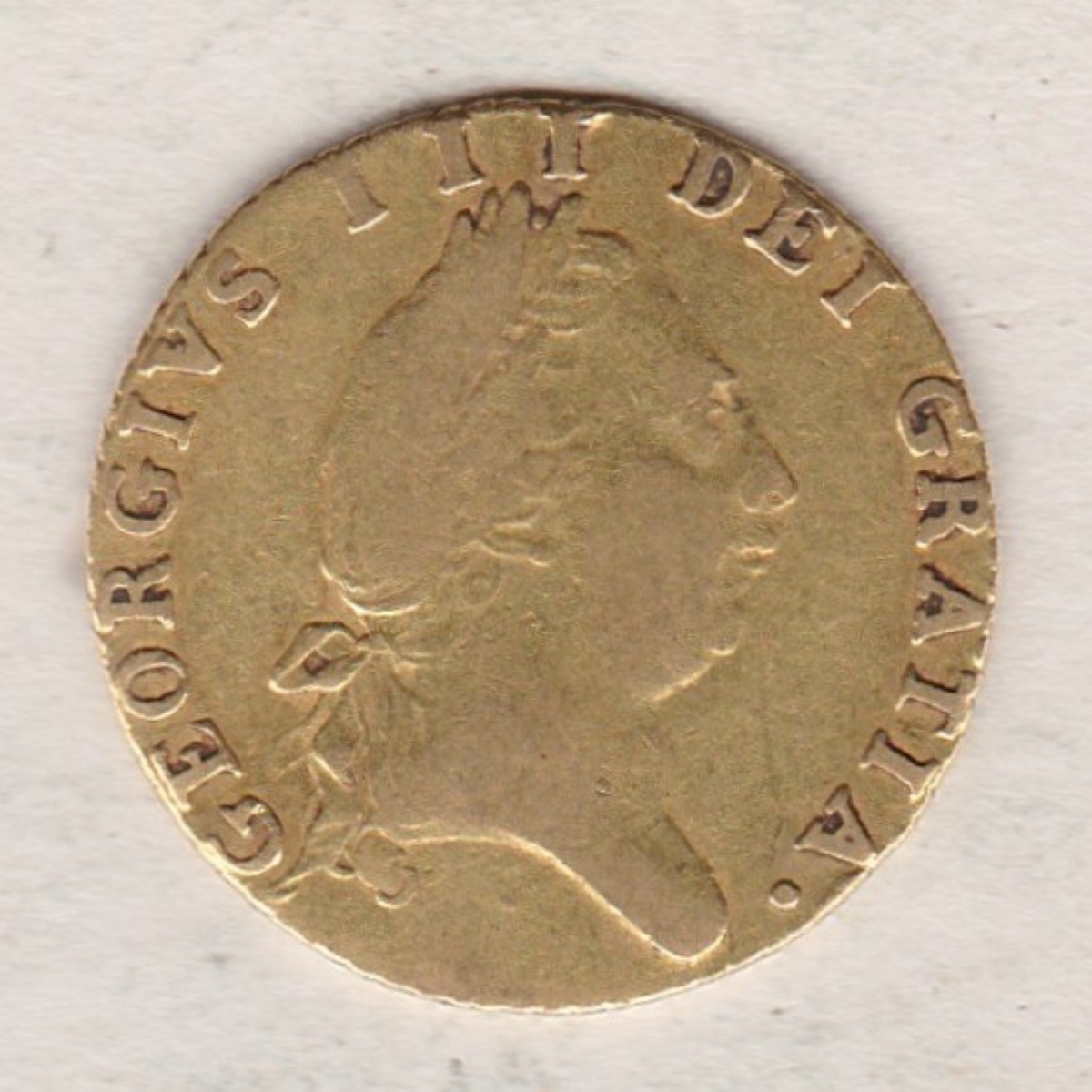 The 1787 gold half guinea was a coin stuck in 22 carat gold. The obverse of this coin features the fifth laureate portrait of King George III facing right, with legend around. The reverse features a crowned quartered shield of arms in the shape of a spade, with legend around, and date below.