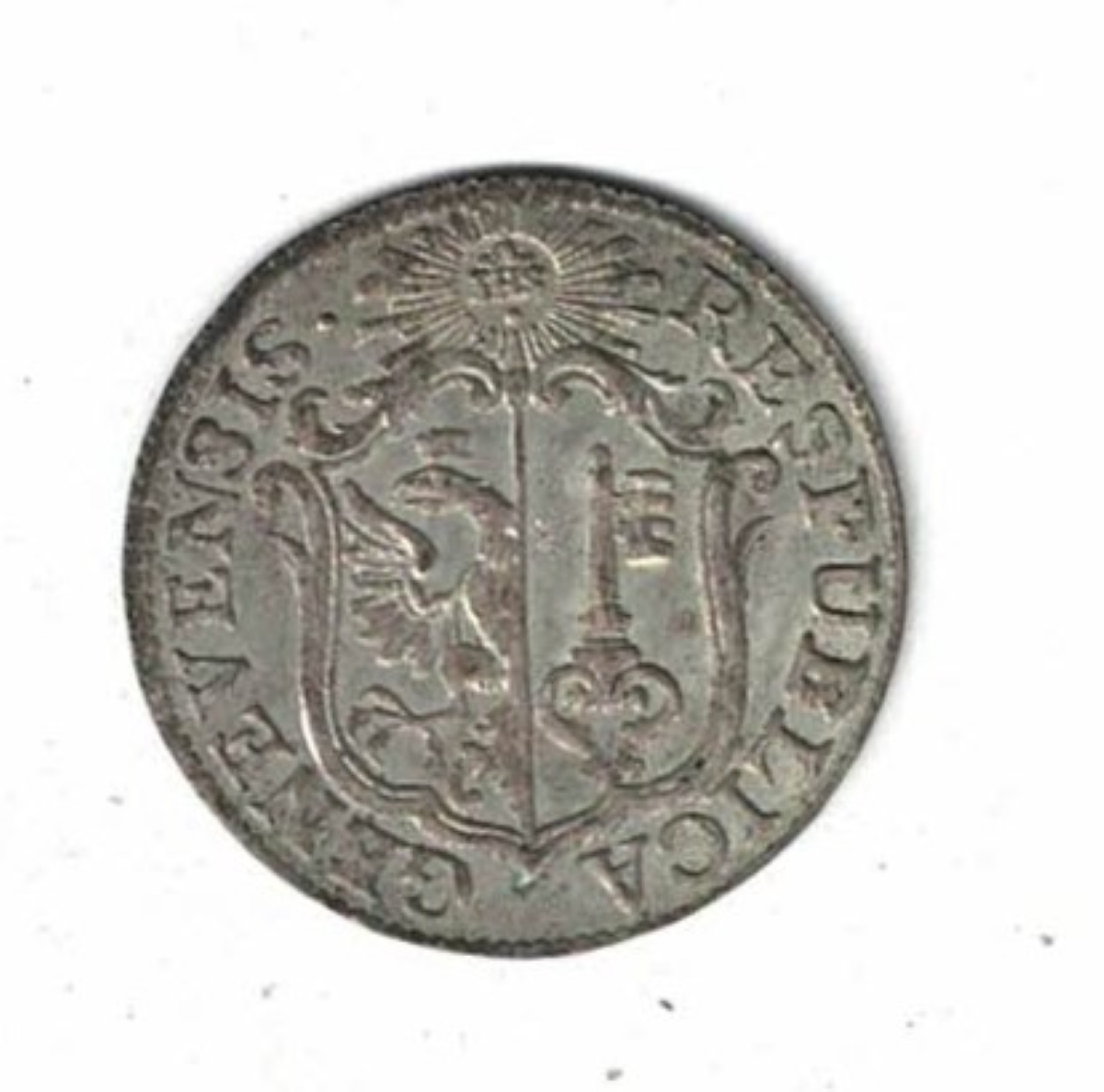 The obverse features the Geneva coat of arms with sun above. The reverse features the denomination & date.