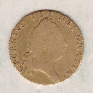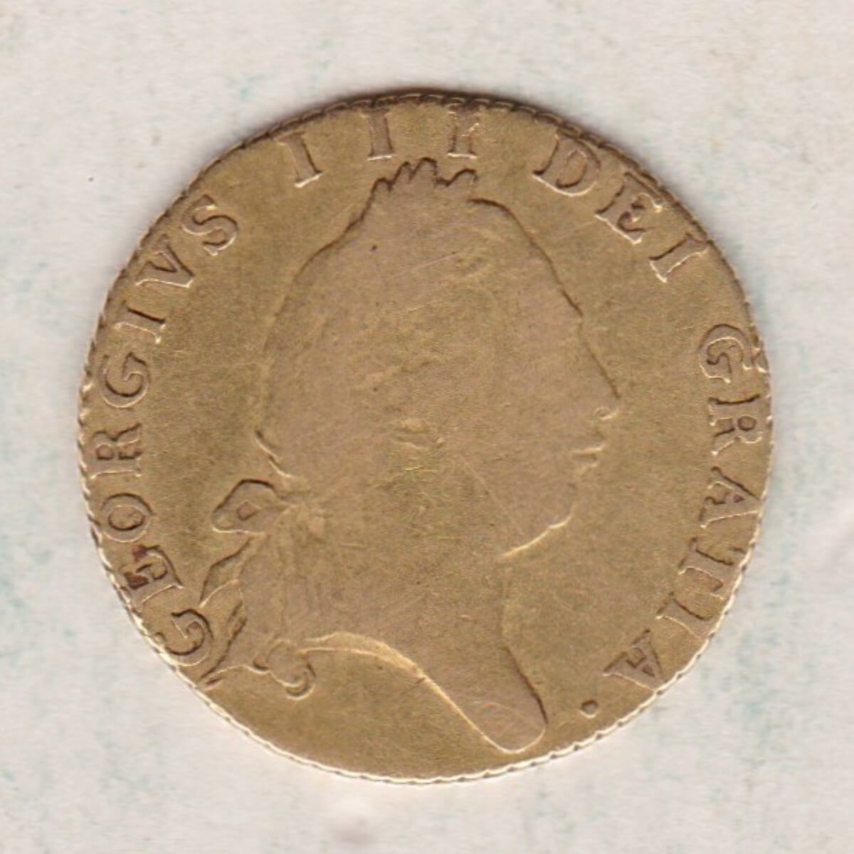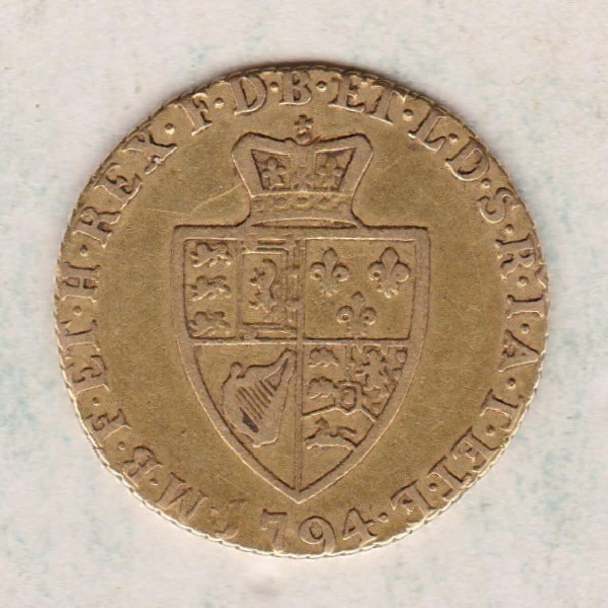 The 1794 gold half guinea was a coin stuck in 22 carat gold. The obverse of this coin features the fifth laureate portrait of King George III facing right, with legend around. The reverse features a crowned quartered shield of arms in the shape of a spade, with legend around, and date below.