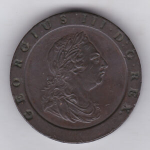 This Cartwheel Twopence is a popular collectors coin. These copper coins were minted in Birmingham, England in 1797. They were the first official coins to be made using modern industrial methods, such as steam-powered machinery, the coin is known for its large size and weight.