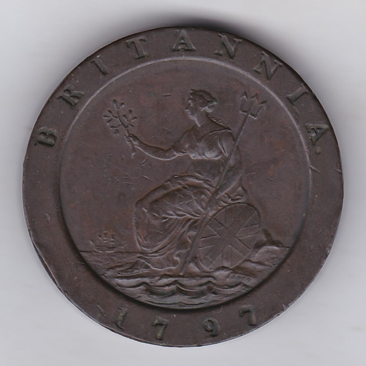 The obverse features the draped bust of King George III facing right, with a Latin legend around it and the letter “K” on the truncation to indicate the coin was designed by Kuchler. The reverse design features a seated figure of Britannia in drapery, holding a trident and an olive branch, and surrounded by waves, a warship, and a Union Jack shield. The word “BRITANNIA” is incused on the upper rim, and the date “1797” is on the lower rim. The word “SOHO” appears next to the shield, indicating the coin was minted at the Soho Mint