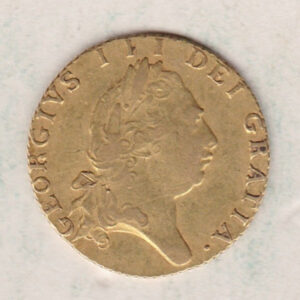 The 1797 gold half guinea was a coin stuck in 22 carat gold. The obverse of this coin features the fifth laureate portrait of King George III facing right, with legend around. The reverse features a crowned quartered shield of arms in the shape of a spade, with legend around, and date below.