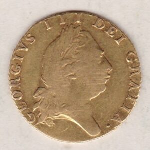 The 1798 gold half guinea was a coin stuck in 22 carat gold. The obverse of this coin features the fifth laureate portrait of King George III facing right, with legend around. The reverse features a crowned quartered shield of arms in the shape of a spade, with legend around, and date below.