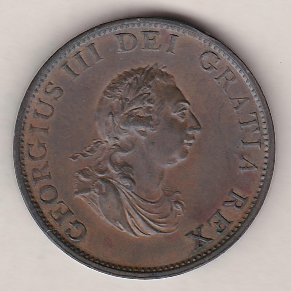 The 1799 halfpenny was struck in copper. The obverse side of the coin features the laureate and draped bust of King George III facing right, with legend around. The reverse depicts the seated figure of Britannia facing left, trident in left hand, olive branch in right, shield with Union flag resting on left, with legend around, and date in exergue.