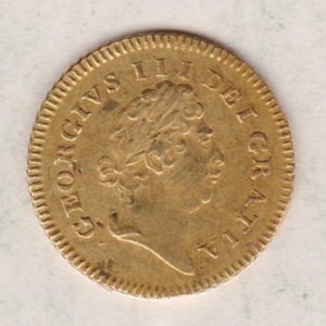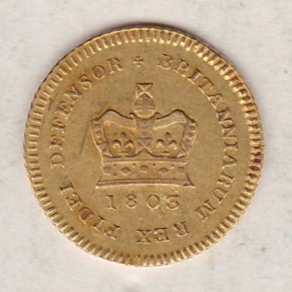 The 1803 gold third guinea was a coin stuck by the Royal Mint in 22 carat gold. The obverse of this coin features the laureate head portrait of King George III facing right, with Latin legend around. The reverse features a central crown with legend around and date below.