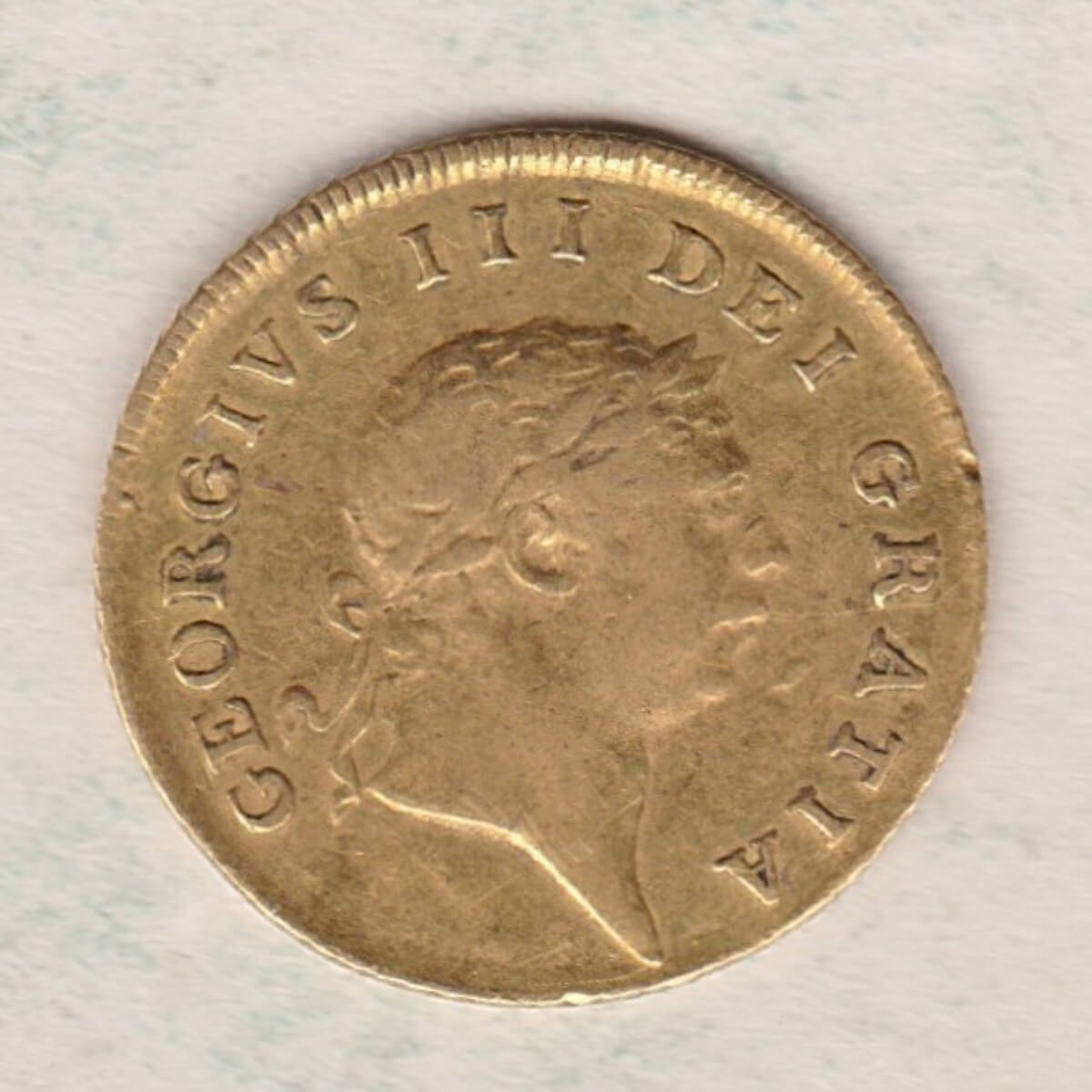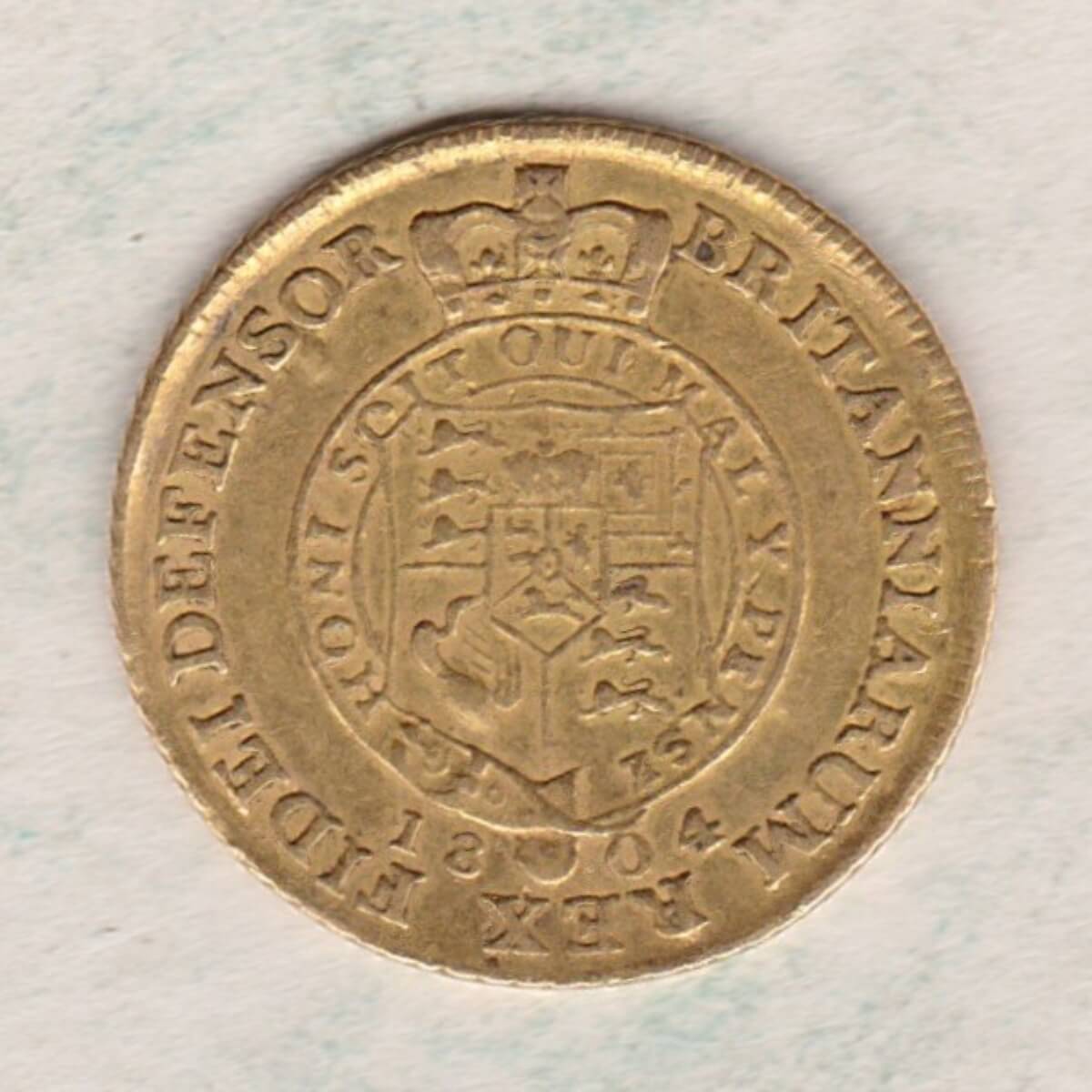 The 1804 gold half guinea was a coin stuck in 22 carat gold. The obverse of this coin features the seventh laureate portrait of King George III facing right, with legend around. The reverse features a crowned shield of arms within garter, with legend around, and divided date below.