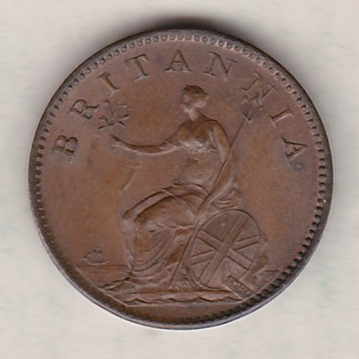 The 1806 farthing was struck in copper by the Soho Mint. The obverse side of the coin features the shorter haired laureate and draped bust of King George III facing right, with legend around, and date below. The reverse features a seated figure of Britannia facing left, trident in left hand, shield with Union flag resting on left, olive branch in raised right hand, legend above, sea behind with ship on left.