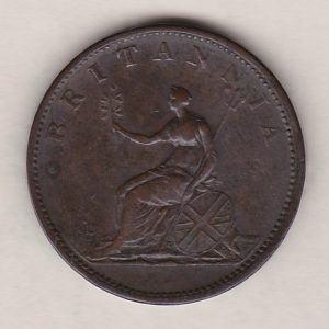The 1806 halfpenny was struck in copper. The obverse side of the coin features the laureate and draped portrait of King George III facing right, with legend around, and date below. The reverse depicts the seated figure of Britannia facing left, with trident in left hand, olive branch in raised right hand. A shield bearing Union flag is resting at left, with sea behind with ship to left. The mint name is on the rock to the right, with legend above, and plain exergue below.
