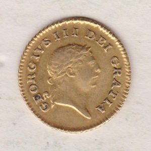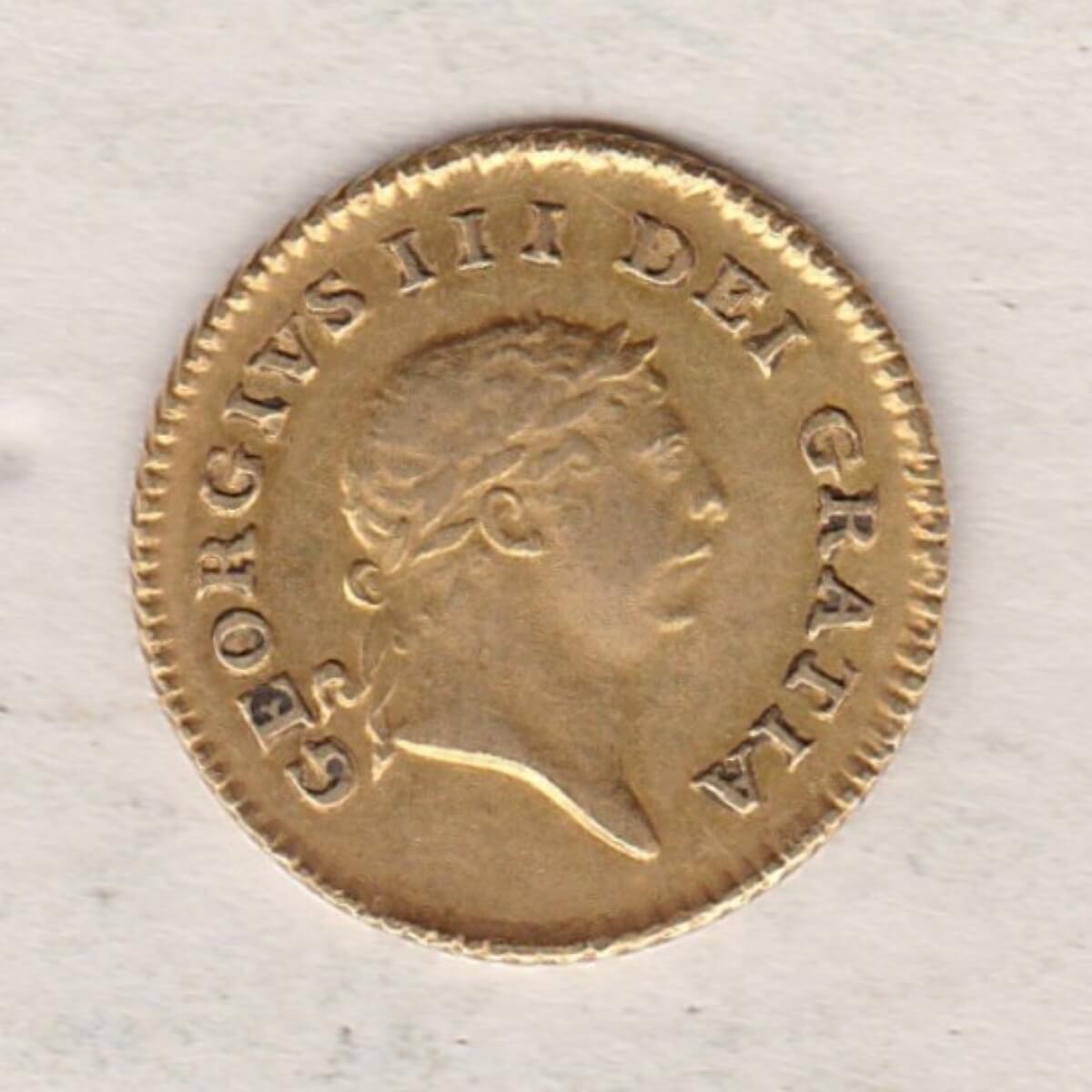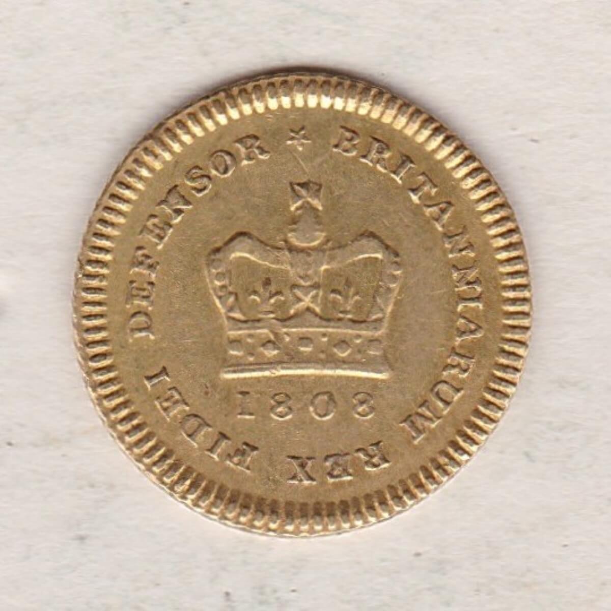 The 1808 gold third guinea was a coin stuck by the Royal Mint in 22 carat gold. The obverse of this coin features the laureate head portrait of King George III facing right, with Latin legend around. The reverse features a central crown with legend around and date below.