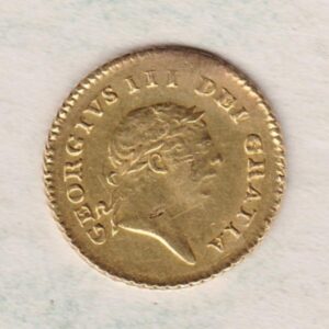 The 1810 gold third guinea was a coin stuck by the Royal Mint in 22 carat gold. The obverse of this coin features the laureate head portrait of King George III facing right, with Latin legend around. The reverse features a central crown with legend around and date below.