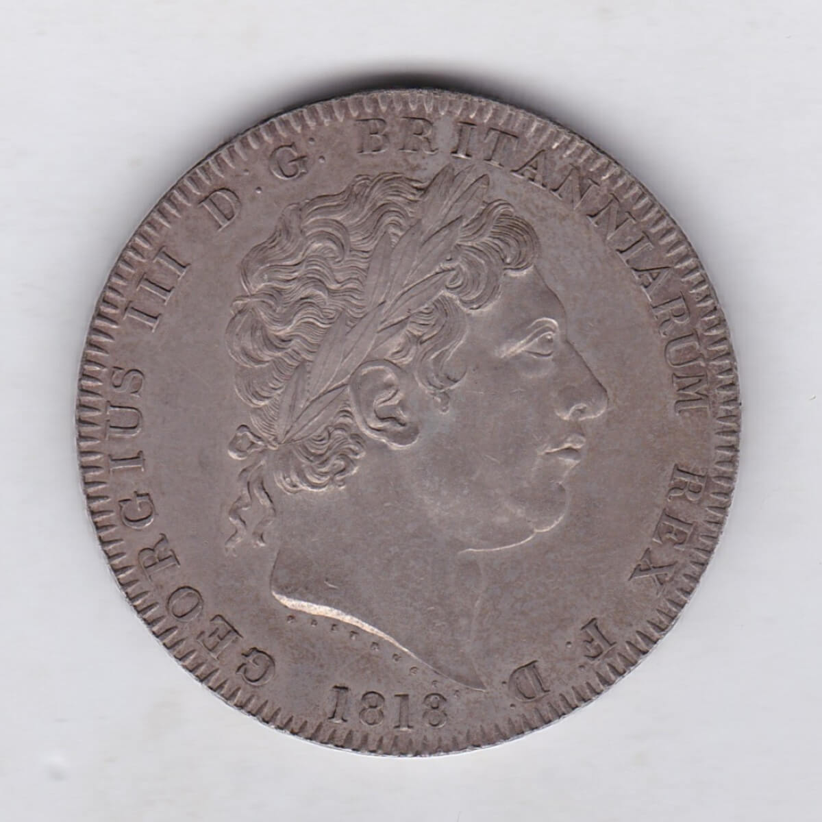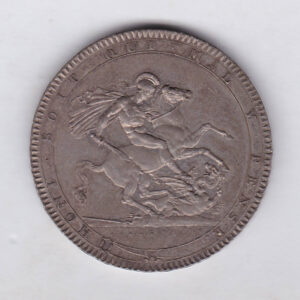 The 1818 LVIII Crown is a coin struck in 0.925 silver by the Royal Mint.  This coin features a laureate head portrait of King George III facing right, with Benedetto Pistrucci’s name below the truncation of the neck. The date appears below the legend on the Obverse.  The reverse shows the famous design of St George on horseback slaying the dragon, with Pistrucci’s name on the ground beneath the horse, and legend around.  Two different edge types were made in this year, this coin has the regnal year LVIII inscribed in raised letters.  Only three different dated crown coins were ever issued during the reign of King George III.