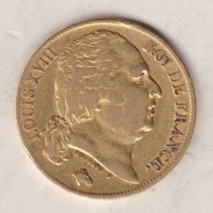 This 1820 French gold coin was minted in Paris.  The obverse features the portrait of Louis XVIII turned to the right, the hair held by a headband tied in the neck. Under this head is inscribed the name of the engraver and a horse’s head. The reverse has the shield of France crowned between two branches of olive tree, with the year below and the inscription 20 F on both sides of the blazon. The A mint mark can be found to the right of the date on the reverse.