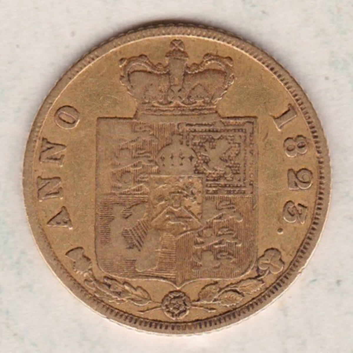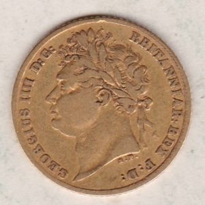 The 1823 gold half sovereign features the laureate portrait of King George IV facing left, with legend around on the obverse. The reverse features a plain crowned shield of arms, with legend and date around, national emblems below.