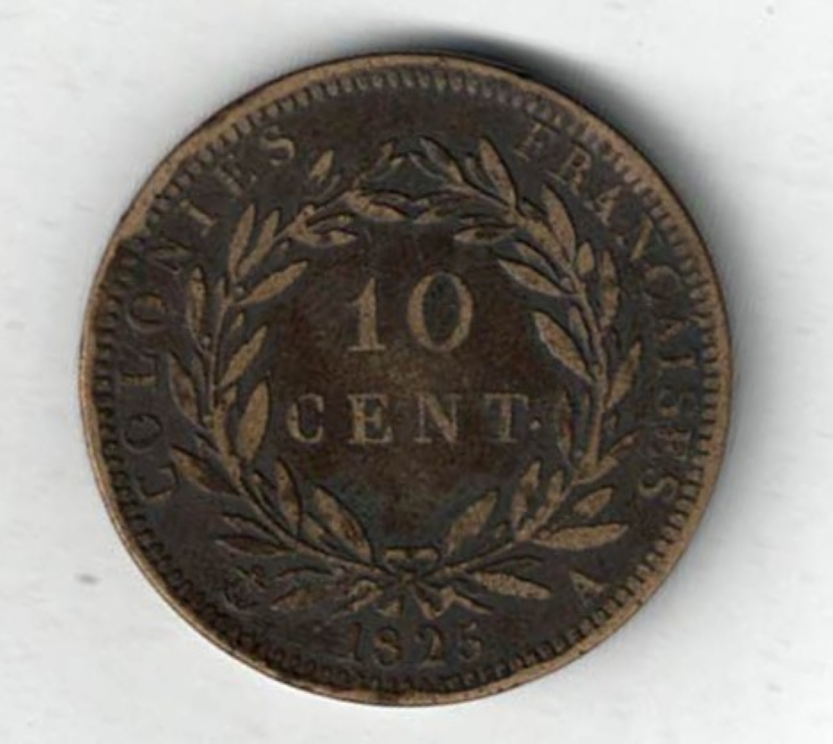 1825 A French Colonies Bronze Ten Centimes Coin. The obverse features the head of Louis-Philippe I facing left. The reverse features the value with wreath.1825 A French Colonies Bronze Ten Centimes Coin