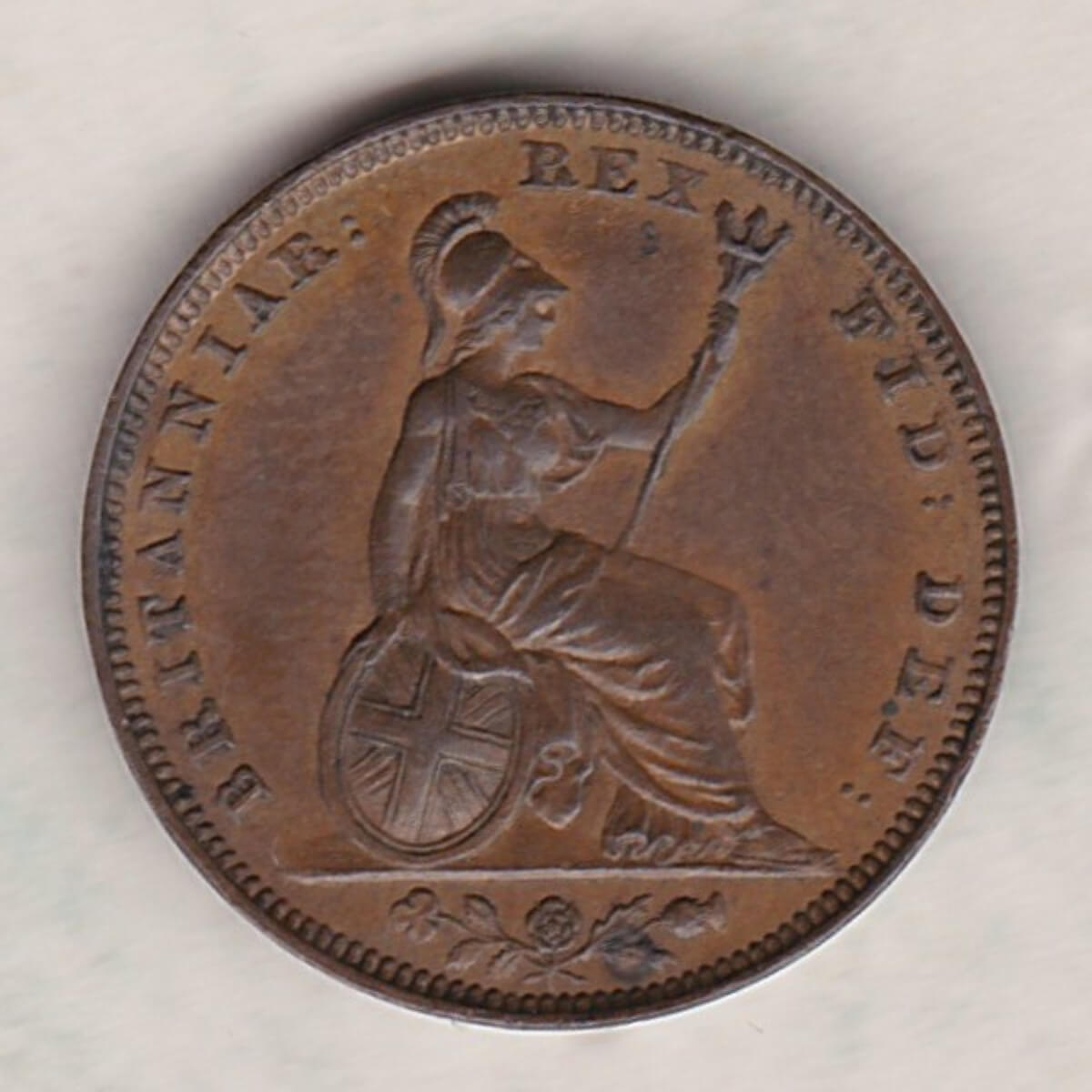 The 1826 farthing was struck in copper by the Royal Mint. The obverse side of the coin features the Laureate portrait of King George IV facing left, with legend around, and date below. The reverse of this coin features the seated figure of Britannia facing right, trident in left hand, shield with Union flag in right, with legend around, and national flower emblems in exergue.