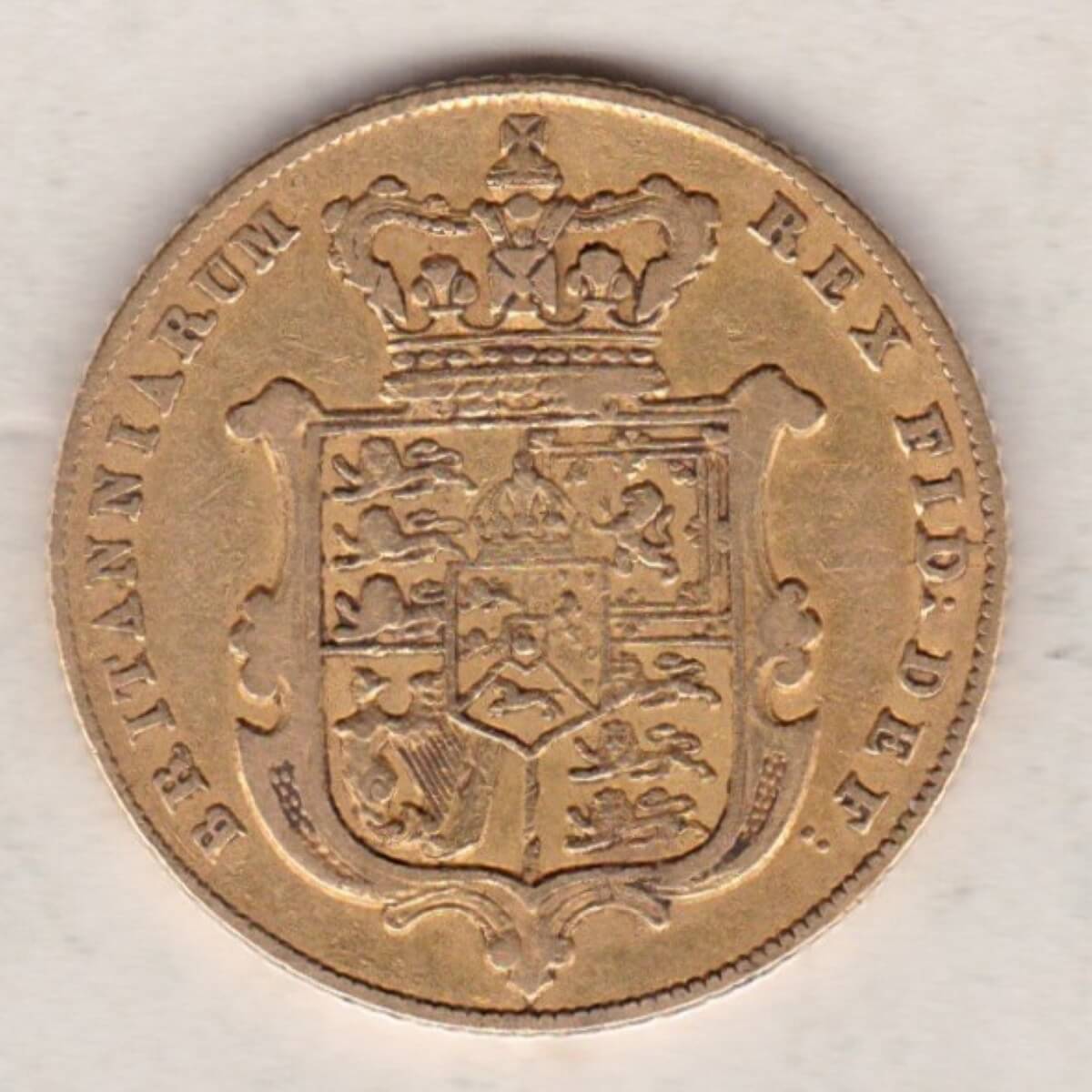 The 1826 sovereign is a coin struck in 22 carat gold by the Royal Mint. The obverse of this coin features the bare head portrait of King George IV facing left, with legend around, and date below. The reverse features a crowned shield of arms and mantle, with legend around.