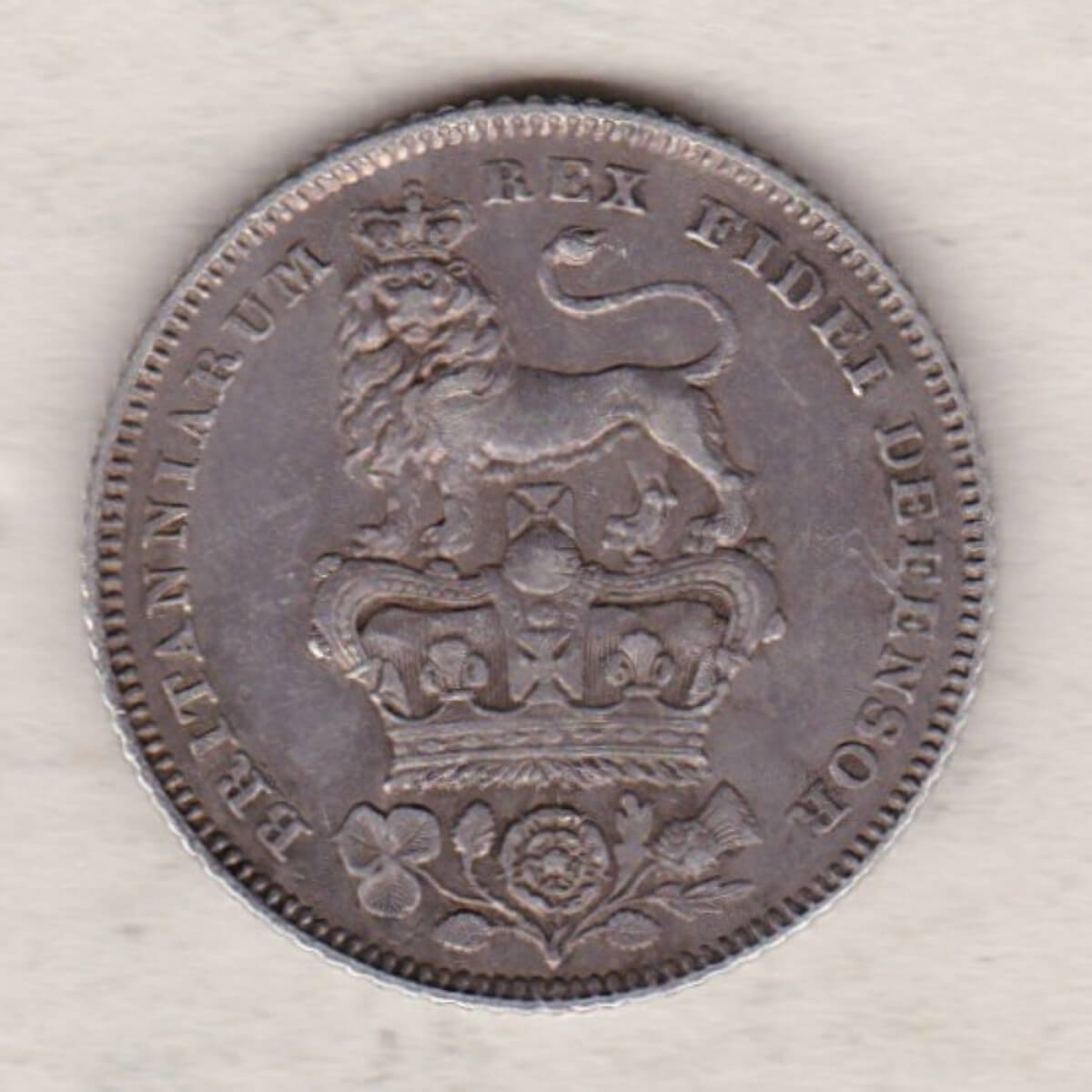 This Sixpence was a coin struck in 0.925 silver by the Royal Mint. The Obverse of this coin features the uncrowned portrait of King George IV facing left, with legend around and date below. The Reverse features a crowned lion passant facing left atop a crown. With legend around, and national flower emblems below.