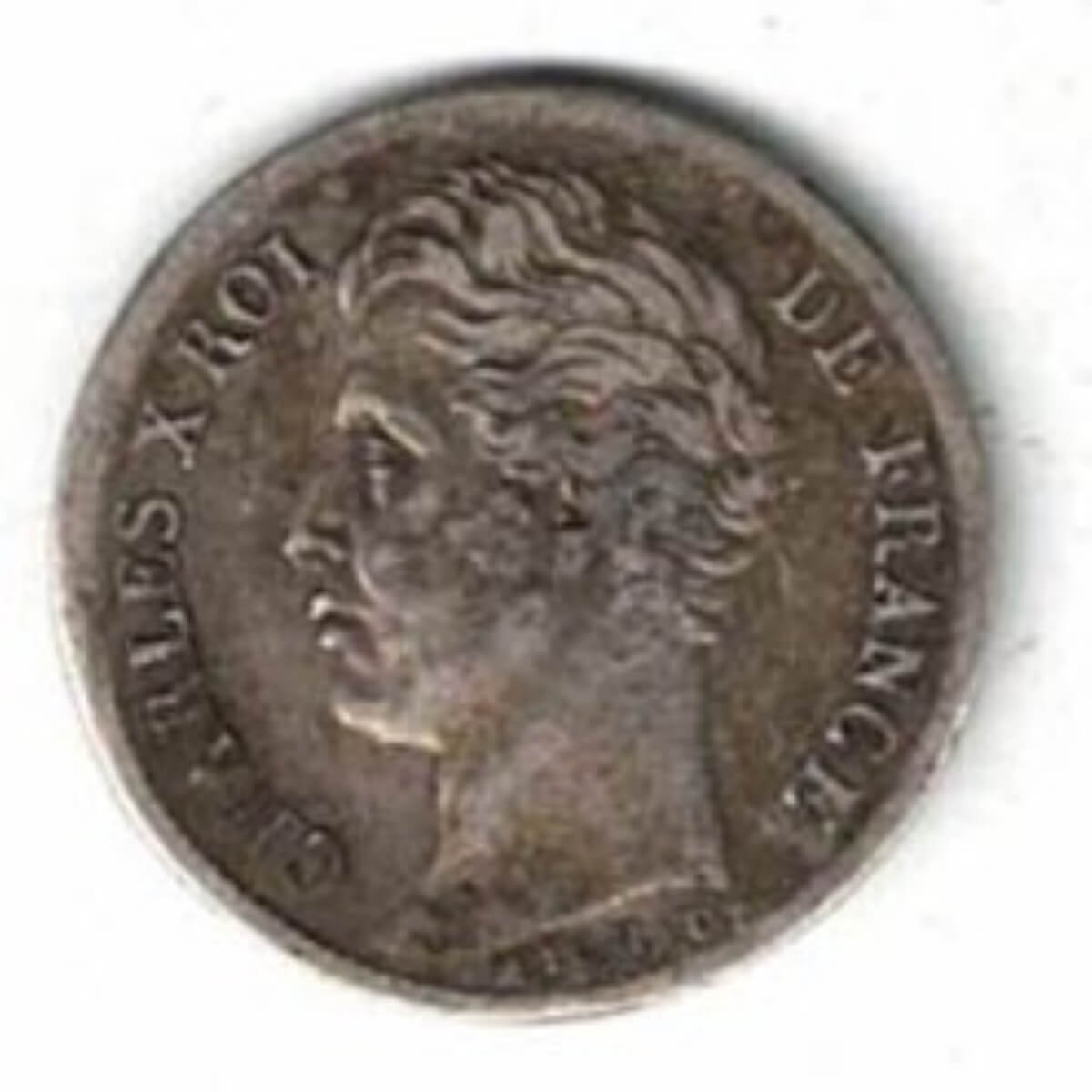 This 1828 French silver coin was minted in Lille. The obverse features bust of Charles X facing left. The reverse features Crowned shield of France between two olive branches letters with date & the letter W indicating the Lille mint.
