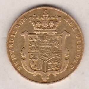 The 1830 sovereign is a coin struck in 22 carat gold by the Royal Mint. The obverse of this coin features the bare head portrait of King George IV facing left, with legend around, and date below. The reverse features a crowned shield of arms and mantle, with legend around.