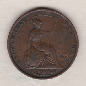 The 1831 halfpenny was struck in copper by the Royal Mint. The obverse side of the coin features the uncrowned portrait of King William IV facing right, with legend around, and date below. The reverse depicts the seated figure of Britannia, with trident in left hand and shield bearing the Union flag in right, with legend around and national flower emblems in exergue.