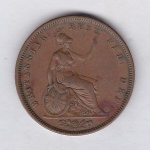 The 1831 penny was struck in copper by the Royal Mint. The obverse side of the coin Features the uncrowned portrait of King William IV facing right, with legend around, and the date 1831 below. The reverse side of the coin depicts Britannia seated facing right holding a trident and resting her right hand on a shield. A rose, thistle, and shamrock are united in the exergue.