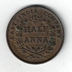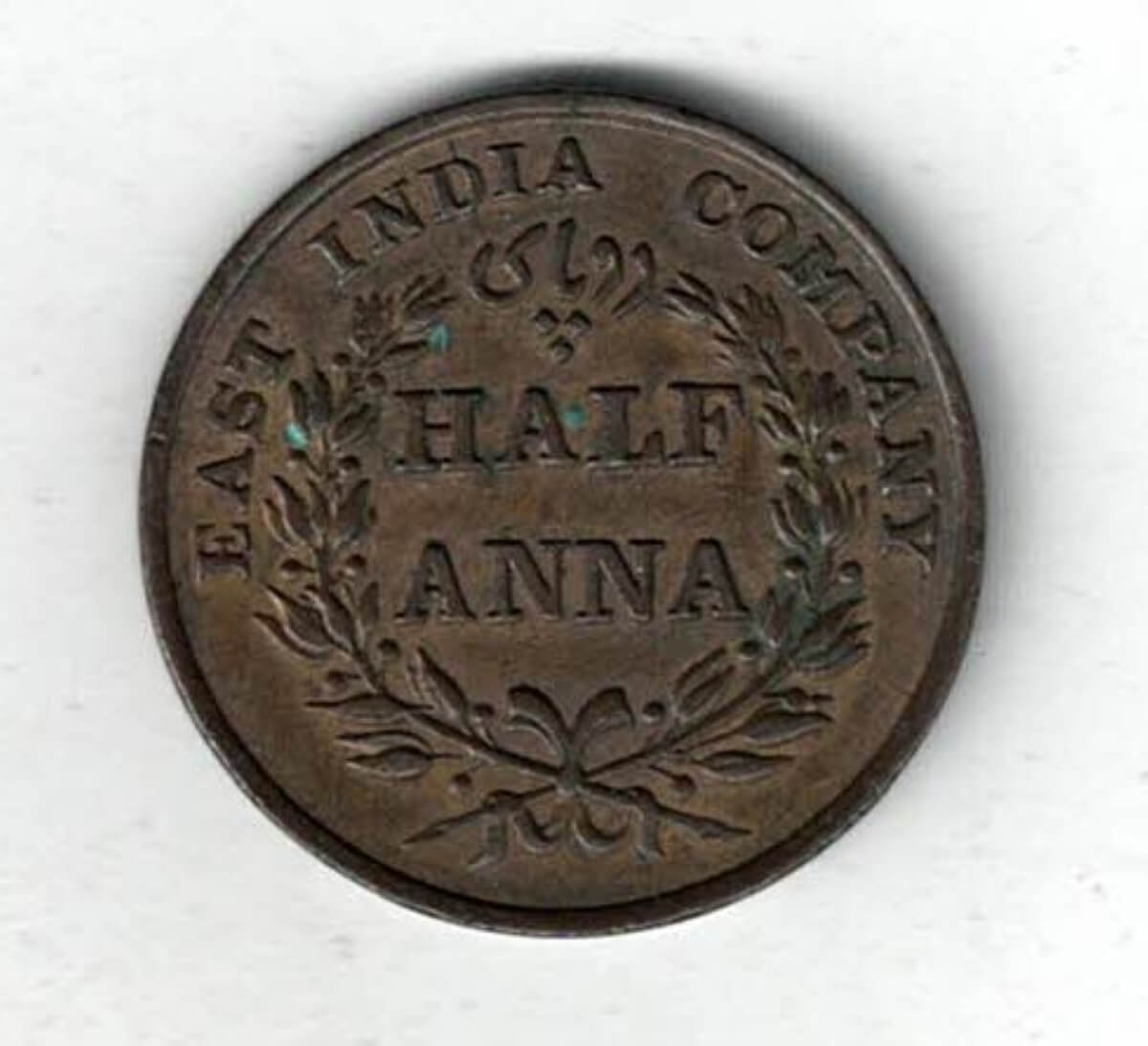 The obverse side of this coin features the coat arms of east India company. The reverse features the denomination within wreath.