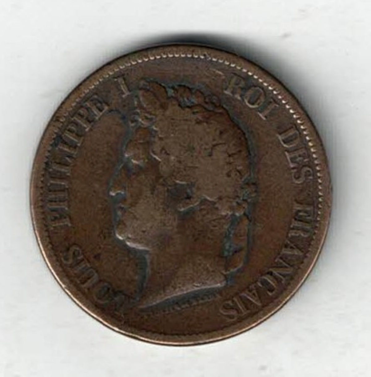 The obverse features the head of Louis-Philippe I facing left. The reverse features the value with wreath and date.