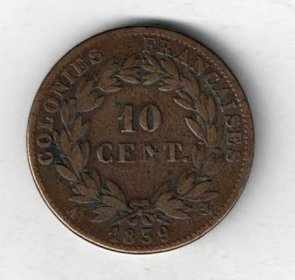1839 A French Colonies (French West Indies) Bronze Ten Centimes Coin In Good Fine Or Better Condition.