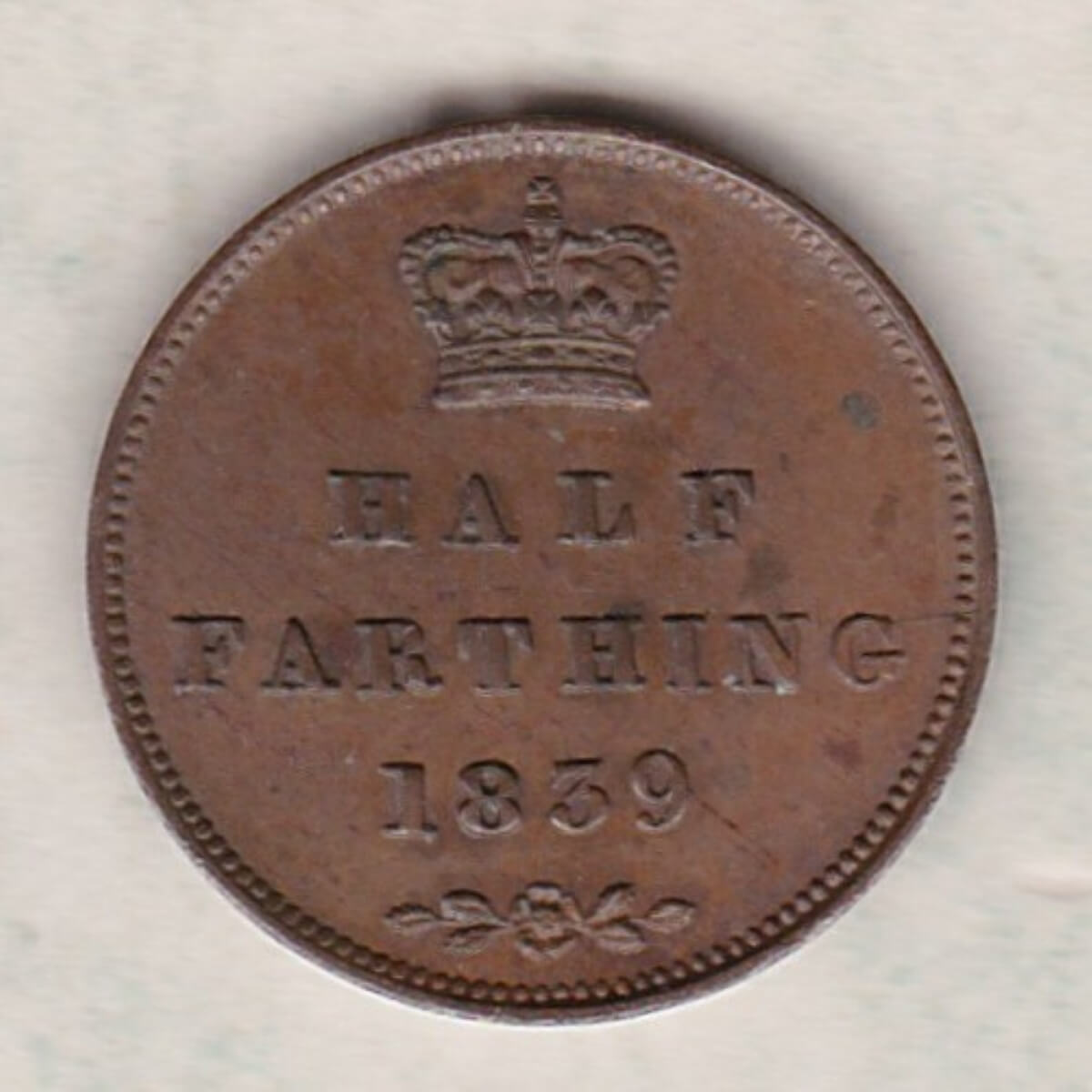 The 1839 Half Farthing is a coin struck in copper by the Royal Mint. The obverse features the first uncrowned portrait of Queen Victoria facing left with legend around, this early image of Queen Victoria is often referred to as the young head design. The reverse has a central crowned denomination with the date underneath. There is a rose, thistle and shamrock below the date.