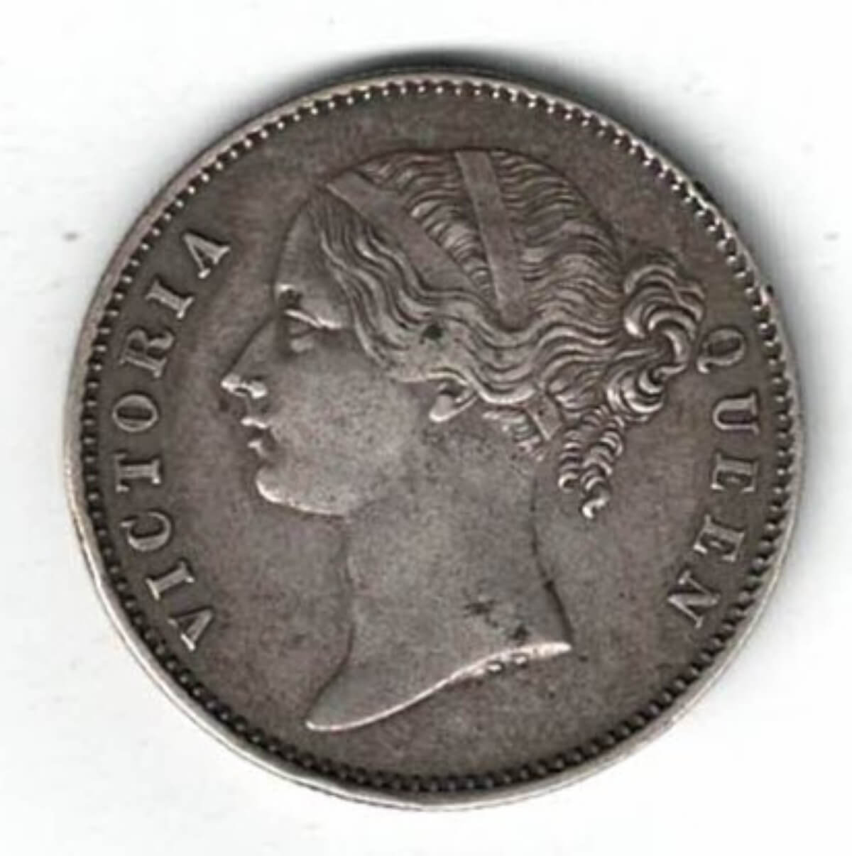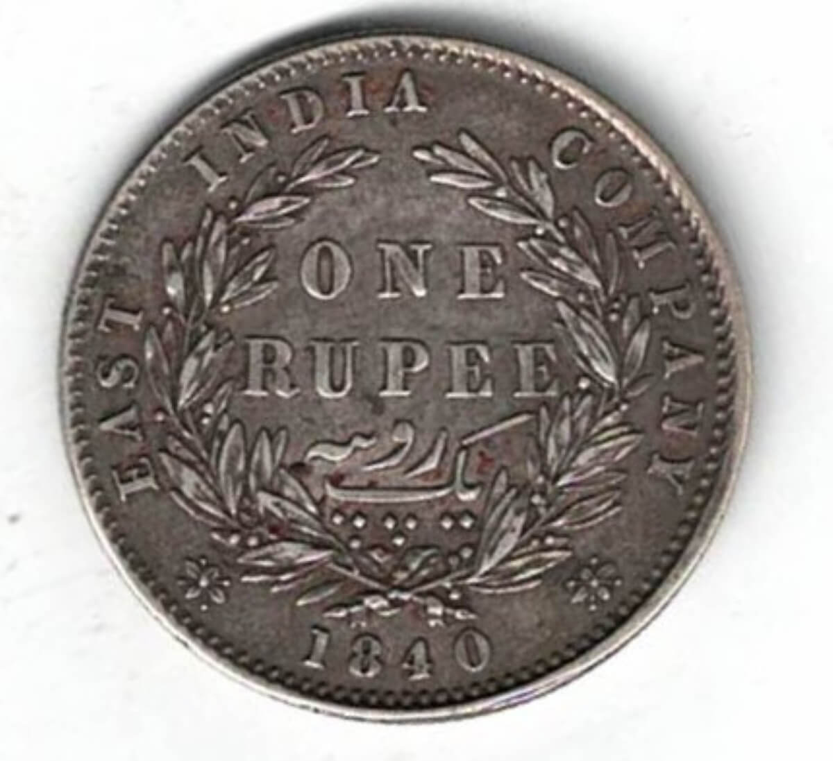 1840 India Silver One Rupee Coin. The obverse side of this coin features the portrait of Queen Victoria. The reverse features the denomination.1840 C India Silver One Rupee Coin