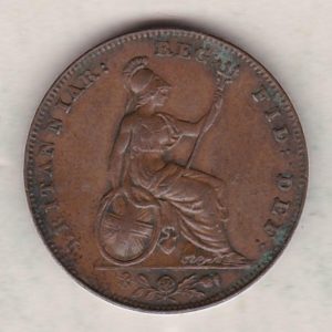 The 1842 farthing was struck in copper by the Royal Mint. The obverse side of the coin features the first uncrowned portrait (‘Young Head’) of Queen Victoria facing left, with legend around, the date below, and initials on bust truncation. The reverse features the seated figure of Britannia, trident in left hand, shield with Union flag in right hand, with legend around, and the national flower emblems in exergue.