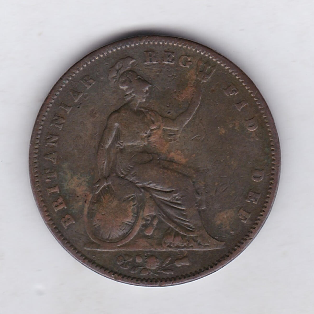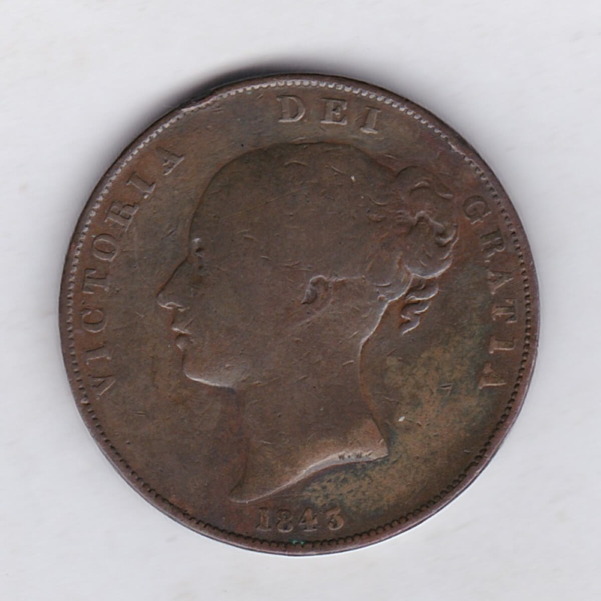 1843 copper penny coin featuring the young head portrait of Queen Victoria on the Obverse. The coin depicts Britannia seated to the right on the Reverse.1843 Copper Penny – Victoria Young Head