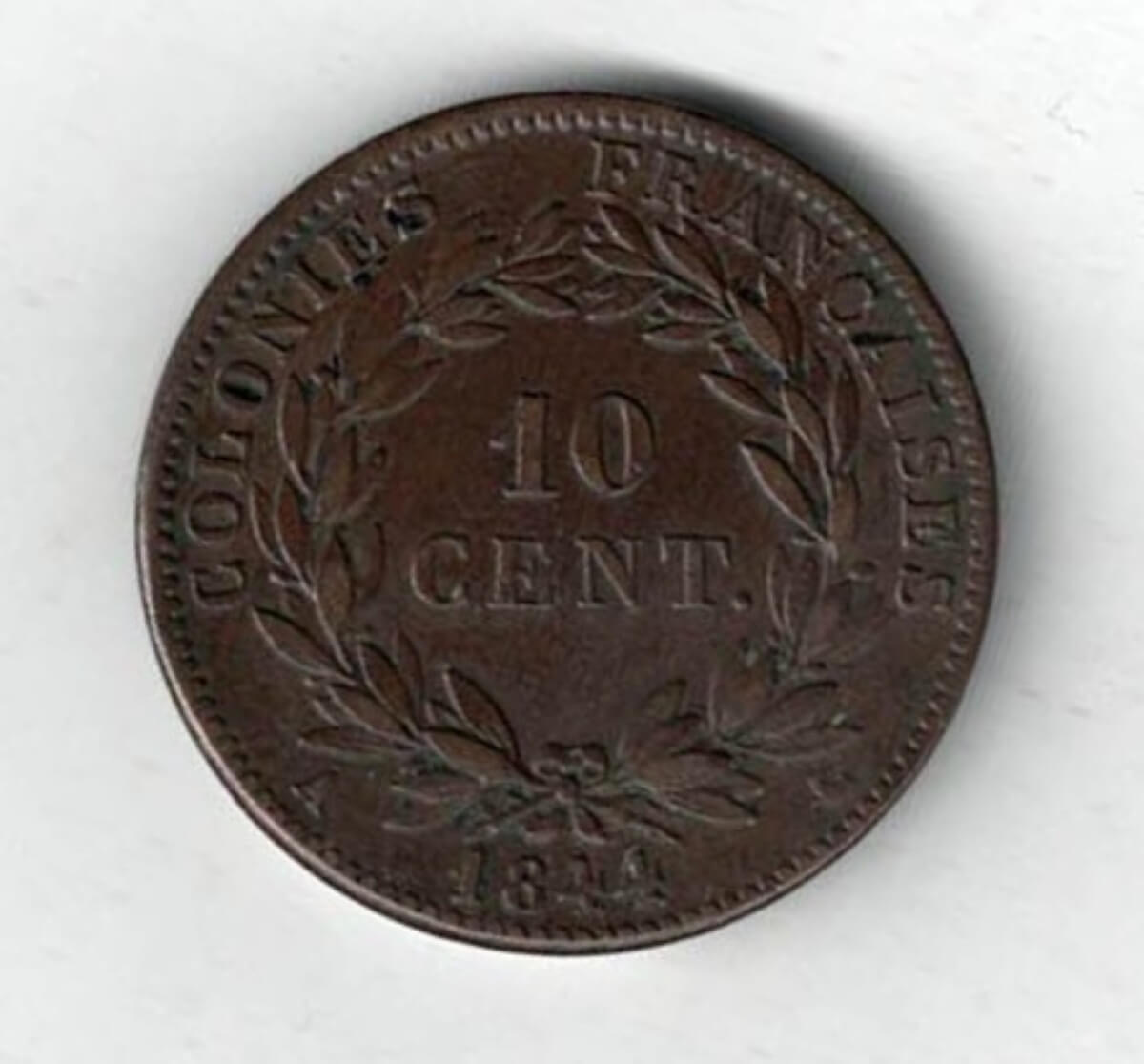 The 1844 ten centimes coin has the A mint mark for Paris. The coin had a mintage of 100,332.