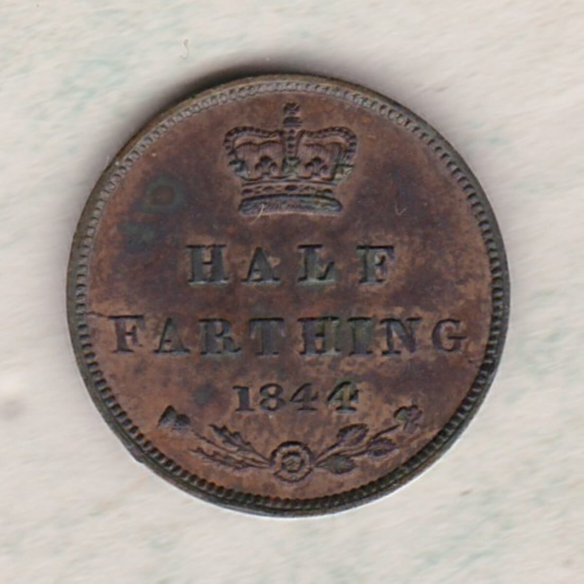 The 1844 Half Farthing is a coin struck in copper by the Royal Mint. The obverse features the first uncrowned portrait of Queen Victoria facing left with legend around, this early image of Queen Victoria is often referred to as the young head design. The reverse has a central crowned denomination with the date underneath. There is a rose, thistle and shamrock below the date.