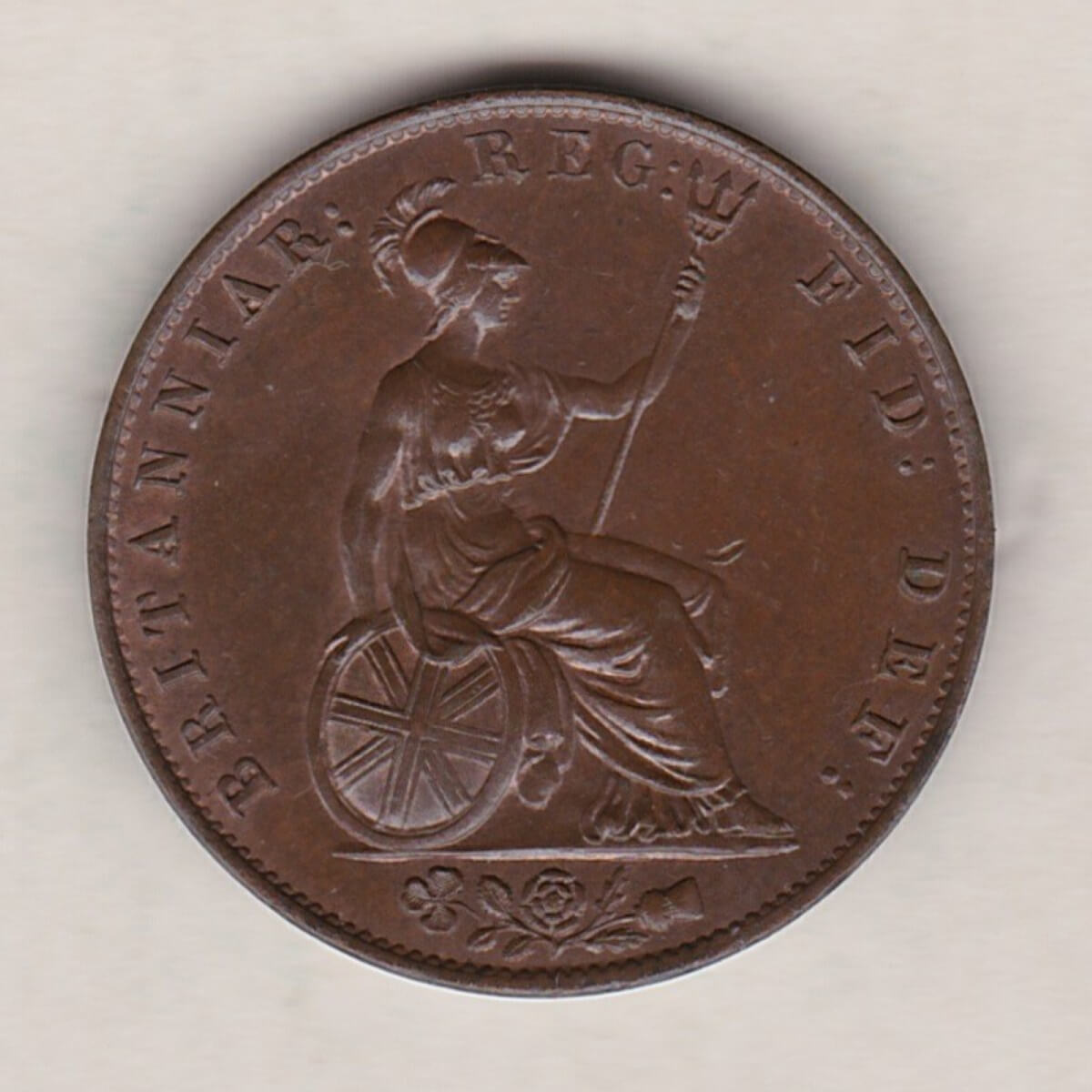 This is a high grade coin. There is a tiny surface mark by the V in VICTORIA on the obverse. There is a tiny surface mark by the knee of Britannia on the reverse.
