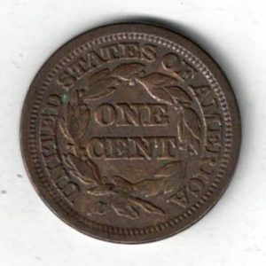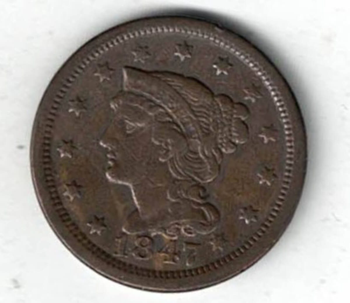 This 1847 one cent coin was minted in Philadelphia. The Obverse features the liberty head facing left. The reverse features the value within wreath.